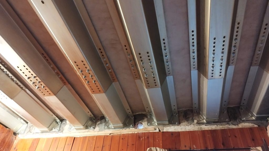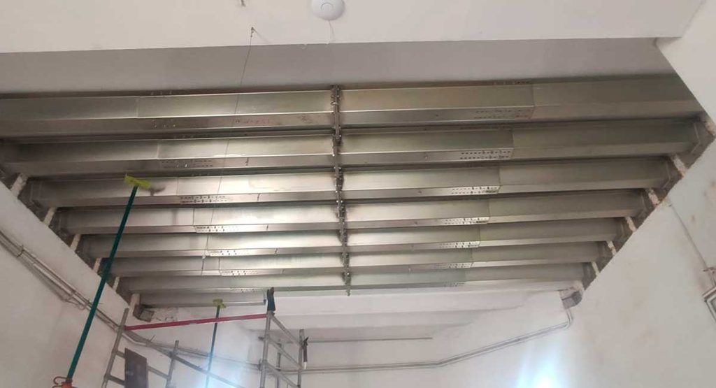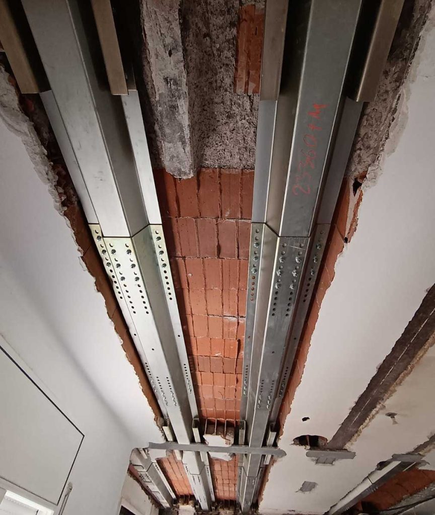 Refuerzo del forjado de una vivienda de Castedelldefels, que sufría aluminosis, con la instalación de nuestro sistema MVV con un apoyo colgado sin soldadura.