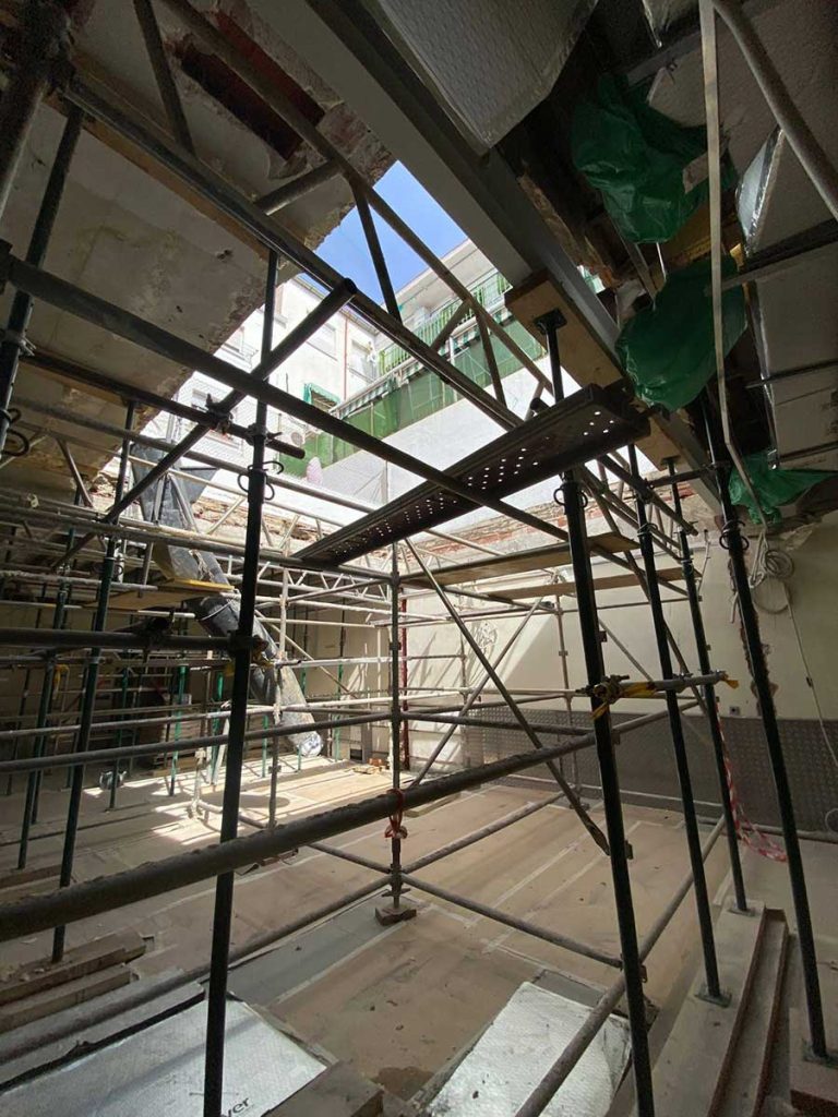Refuerzo del forjado de esta vivienda en la Plaça de Sant Jaume en Barcelona, que sufría pudrición en sus vigas de madera, con nuestros sistemas MVH y MVV.